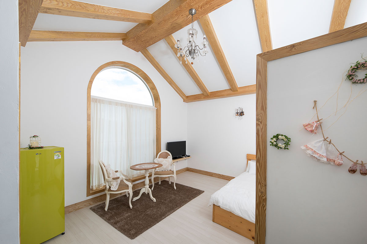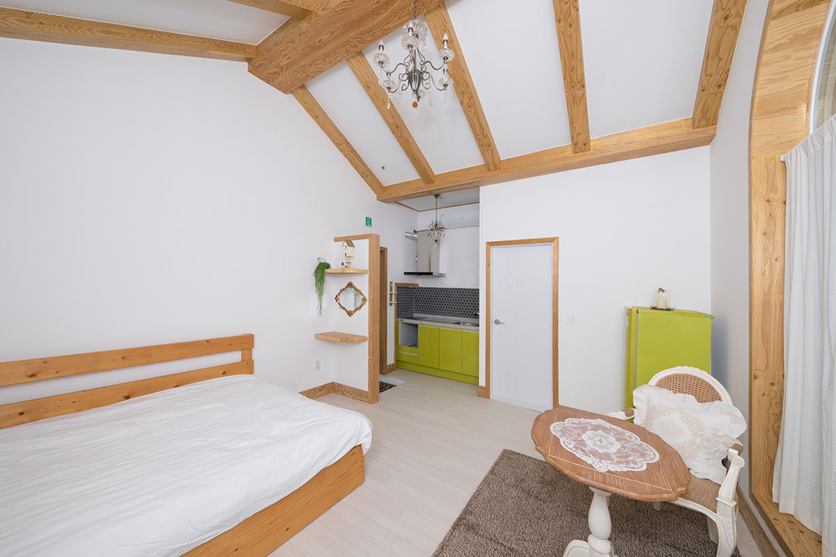 침대, 쇼파, TV32인치, 냉장고, 침구류, 에어컨(냉난방형), 헤어드라이기, 비누, 샴푸, 수건, 주방도구일체