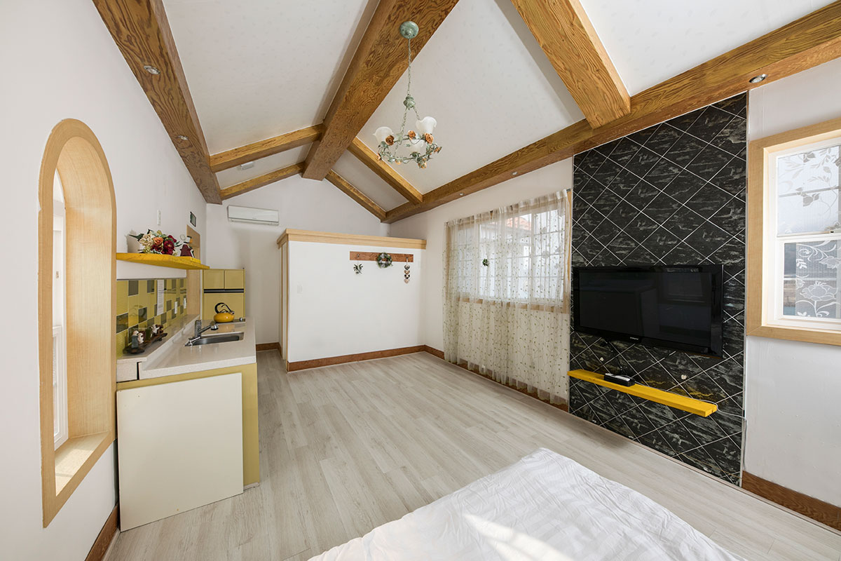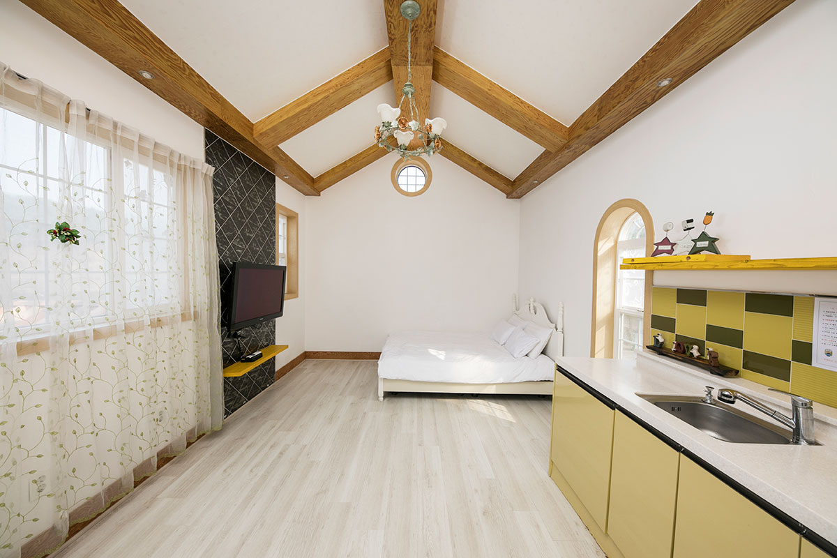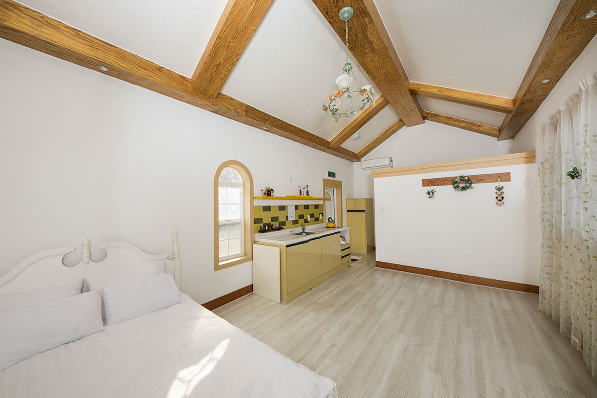 침대, 쇼파, TV42인치, 냉장고, 침구류, 에어컨(냉난방형), 헤어드라이기, 비누, 샴푸, 수건, 주방도구일체