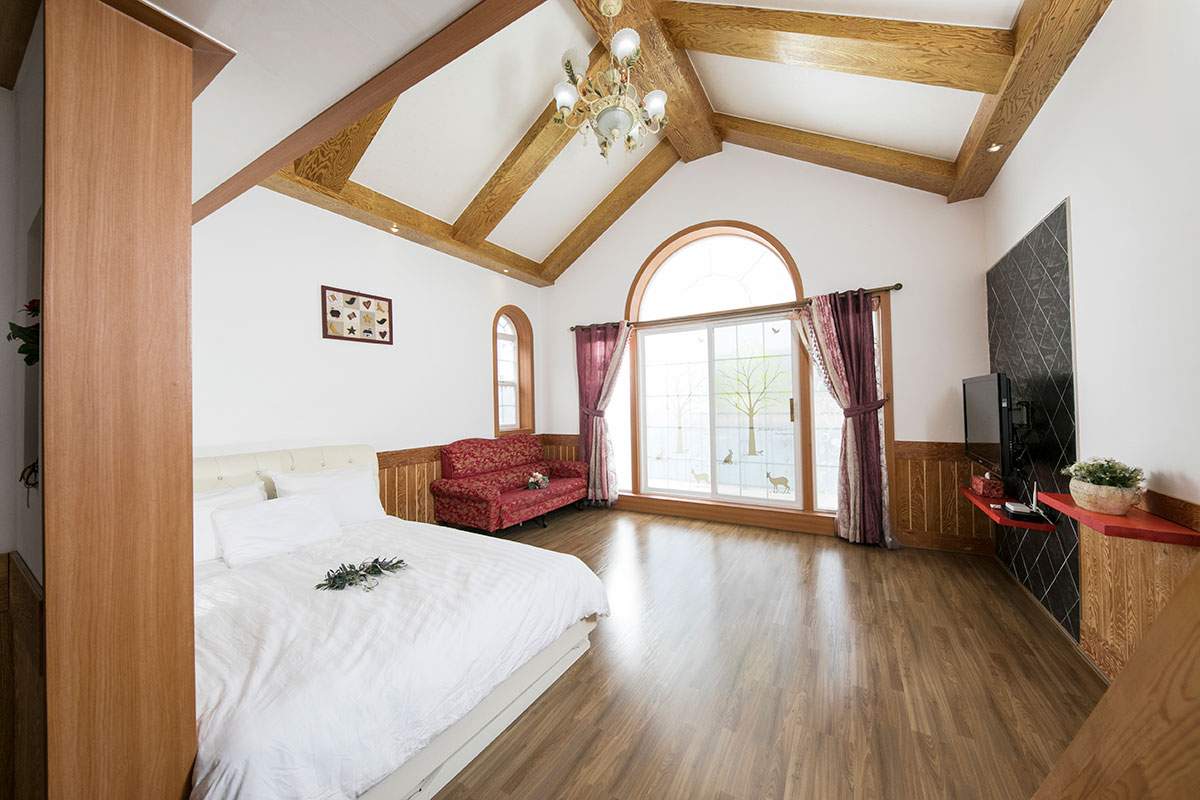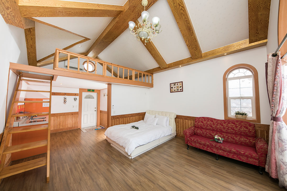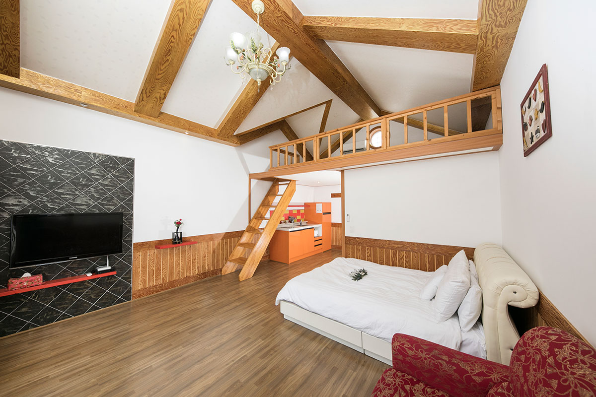 침대, 쇼파, TV42인치, 냉장고, 침구류, 에어컨(냉난방형), 헤어드라이기, 비누, 샴푸, 수건, 주방도구일체